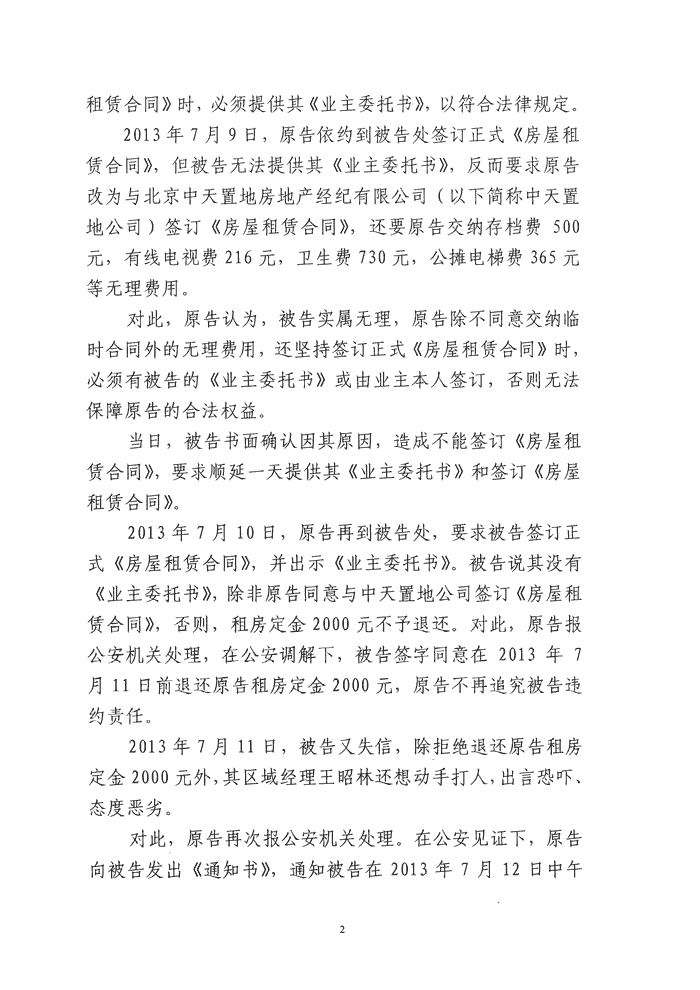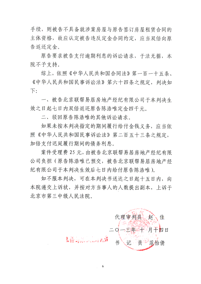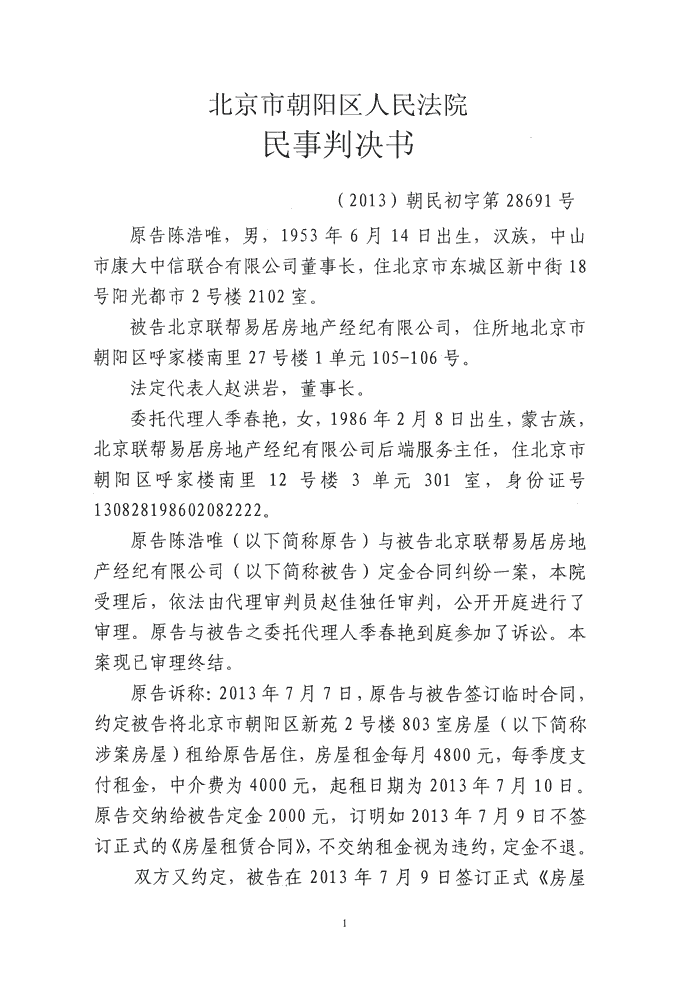 北京黑中介坑骗租房人定金,因属民事纠纷,报公安都没有。导致黑中介有恃无恐,无理强硬没收租房人定金。黑中介还明告诉租房人, 你去法院打完官司,赢了还不能够付律师费,态度恶劣。港商陈浩唯亲自状告黑中介,经过二天开庭审理,北京朝阳区法院判决陈浩唯胜诉,黑中介双倍返还定金。