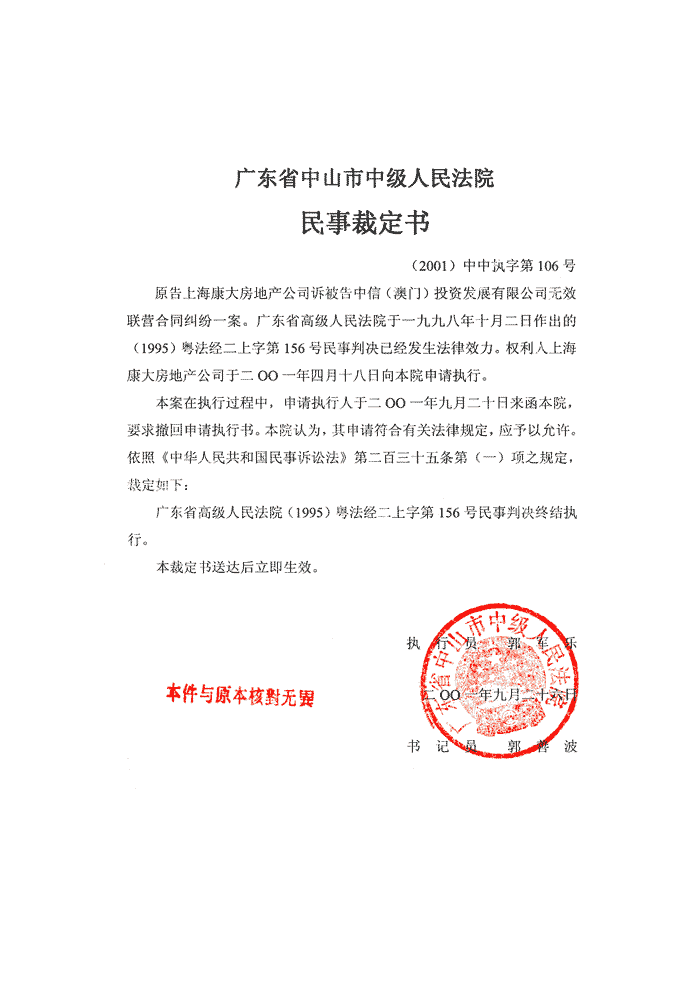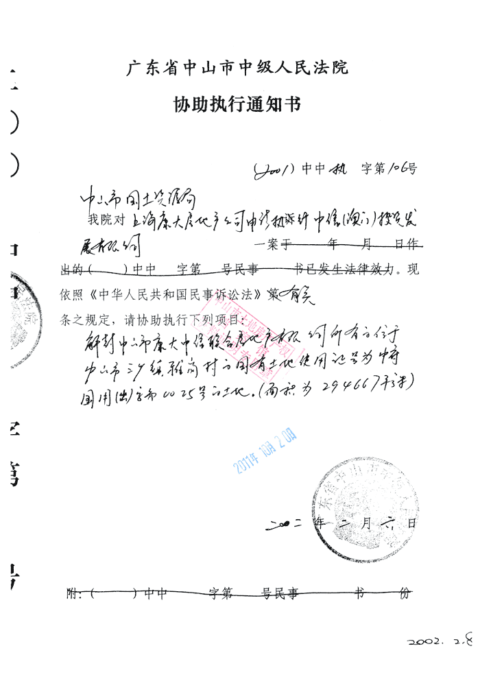 >> (2001)中中执字第106号《裁定书》和《协助执行通知书》