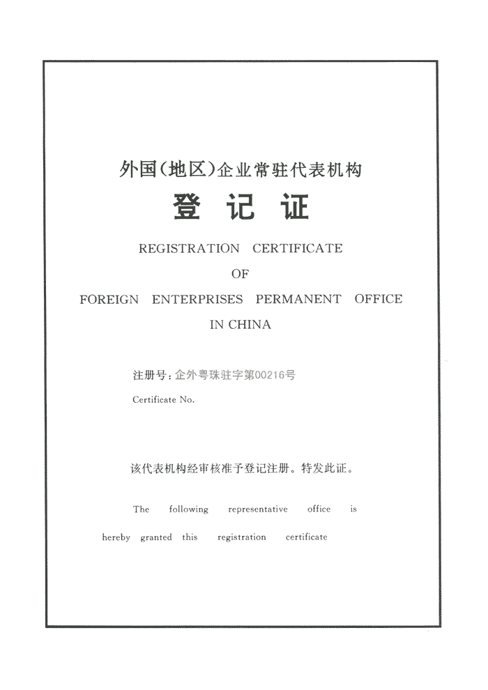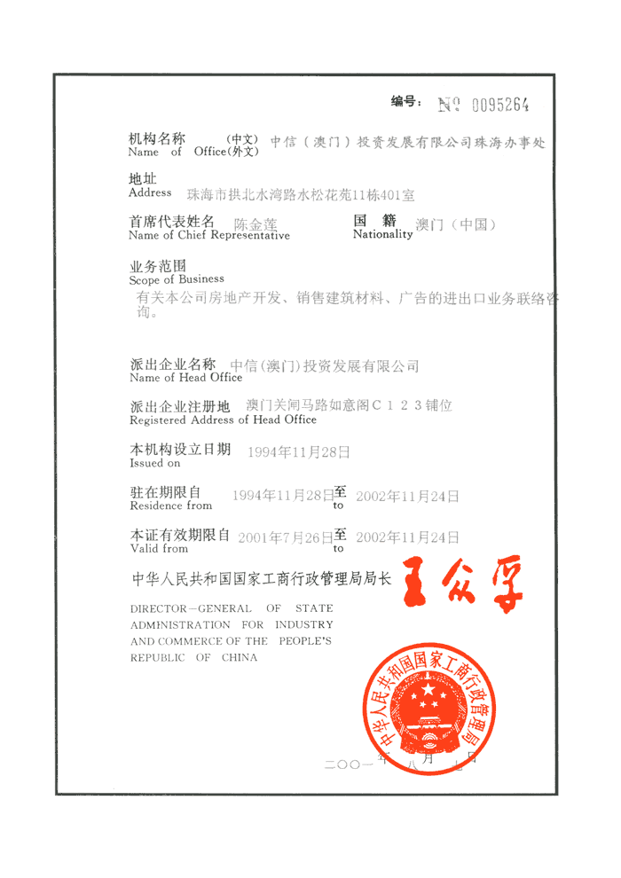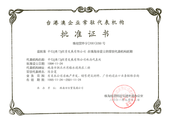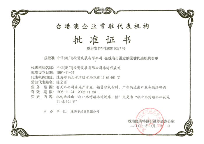 >> 澳门中信的《登记证》和常驻《批准证书》