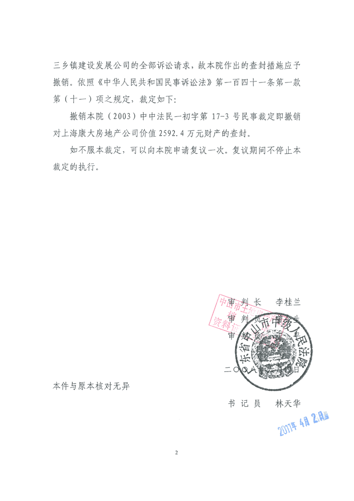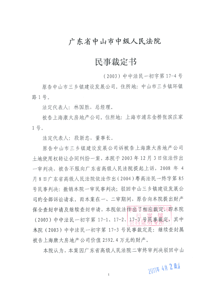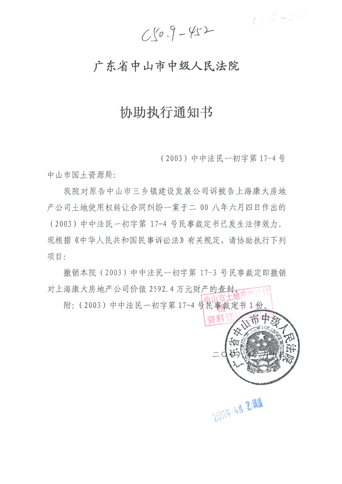 >> (2011)中中法民一初字第17-4号《民事裁定书》和《协助执行通知书》