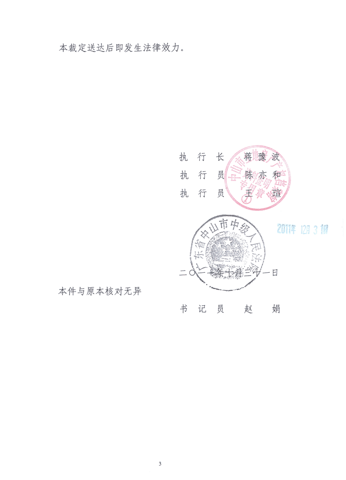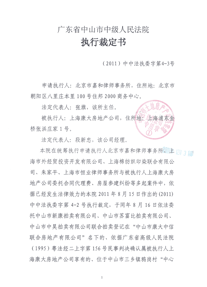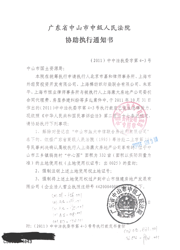 >> (2011)中中法执委字第4-3号《执行裁定书》和《协助执行通知书》