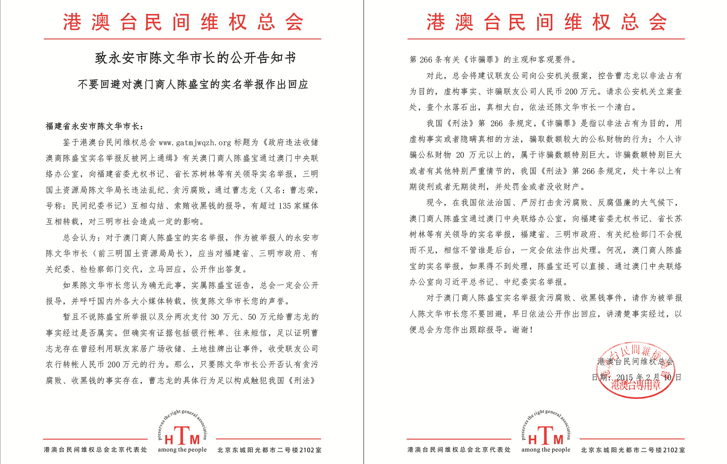港澳台民间维权总会致现任永安市市长陈文华的公开告知书