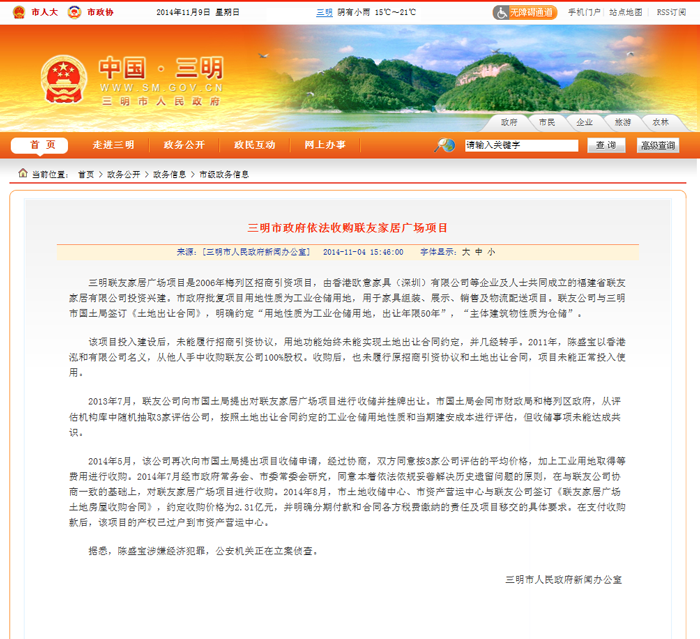 2014年11月4日,三明市人民政府在其官网刊登《三明市人民政府依法收购联友家居广场项目》,对陈盛宝所述事实有争议,并声称三明市政府是依法收购联友家居广场项目,合法有效。
