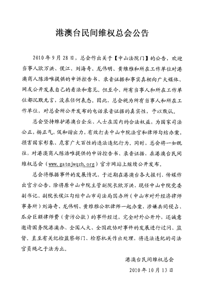 陈浩唯向最高人民法院提交《国家赔偿请求书》,状告中山中院、上海一中院、上海二中院、上海浦东法院、上海黄浦法院违法执行,请求共同国家赔偿13.28亿元。
