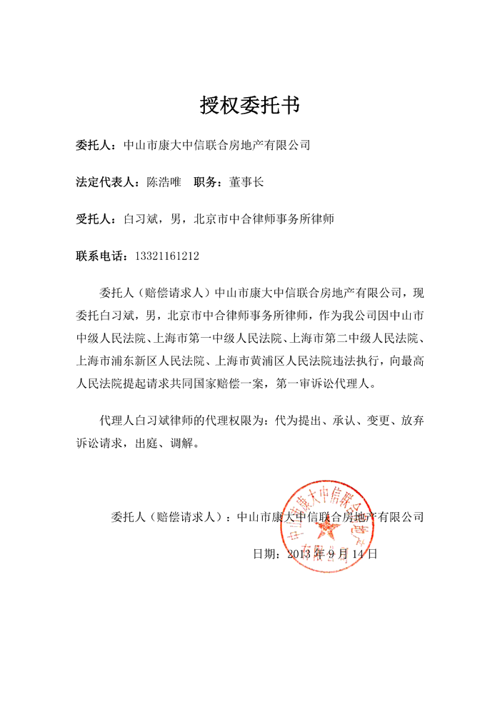 港澳台民间维权总会支持国家反腐败,维护我国司法公正,守法维权,首席法律顾问白习斌律师已经接受陈浩唯投资的中山市康大中信联合房地产有限公司委托代理,向最高人民法院提交《国家赔偿请求书》,请求确认中山市中级人民法院、上海第一中级人民法院、上海第二中级人民法院、上海市浦东新区人民法院、上海市黄浦区人民法院违法执行,请求国家赔偿13.28亿元(暂定)一案。《国家赔偿请求书》连证据附件,将在2013年9月25日下午在网上予以公开。