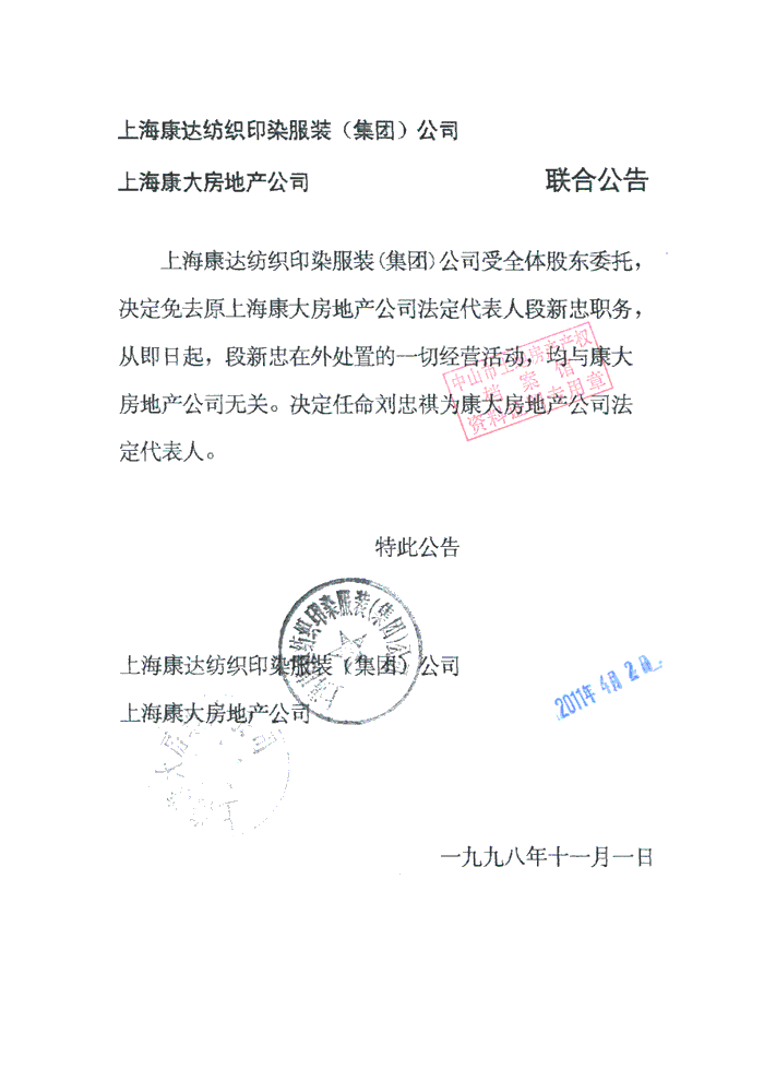 近年来,上海有些不良分子以 “伪造” 上海康大房地产公司、中山市康大中信房地产有限公司等公司 “公章” ,在上海进行虚假诉讼、取得法院判决书,并声称受上海康大房地产公司“段新忠”委托、勾结广东律师在中山、珠海、江门、佛山等地,以 “伪造” 上海康大房地产公司等公司 “公章” 所盖的《委托书》,超低价出卖权利人为中山市康大中信联合房地产有限公司名下的土地,以收取接待交通费、土地差价、中介费、律师委托费等名义进行诈骗,中山、珠海、江门已有多人先后上当受骗向本人投诉。