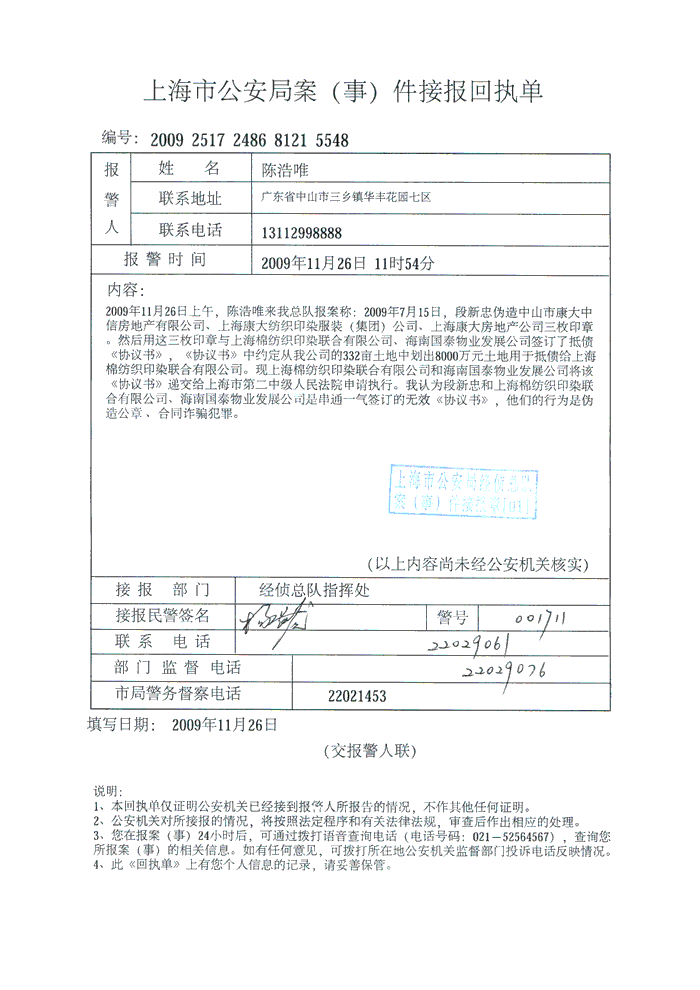 上海康大房地产公司在2002年已被吊销工商执照,公司公章之后亦被收缴,而中府国用(出)字第0025号国有土地使用证的权利人,由始至今仍是登记在中山市康大中信联合房地产有限公司名下,该公司的法人代表为本人陈浩唯,至今从未变更过。