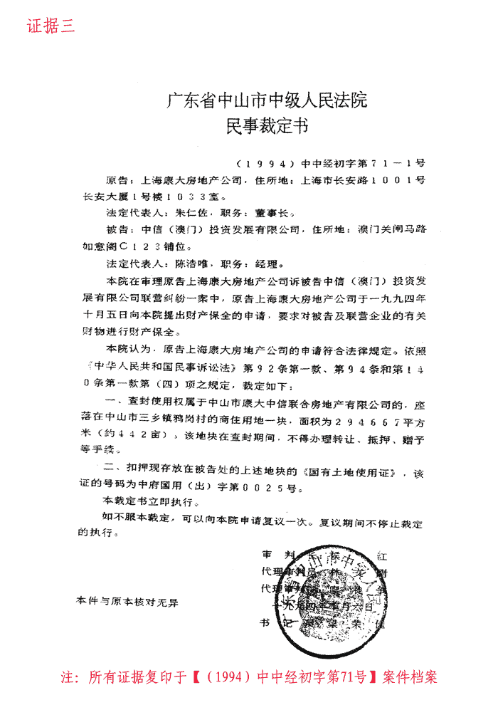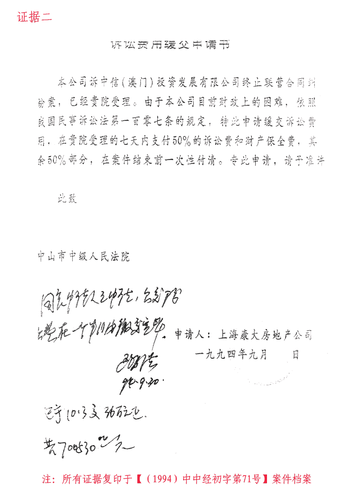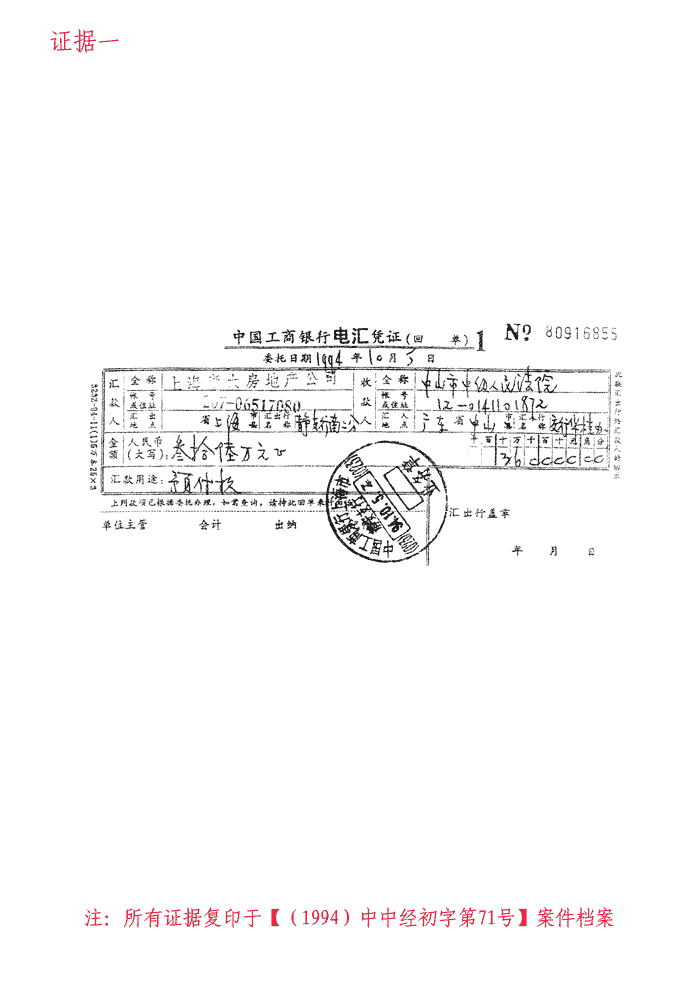 一、【(1994)中中经初字第71号】案件,原告上海康大公司于1994年10月5日才经上海工商银行汇出36万元诉讼费(证据一),按照当年银行规定,起码七天以后才能到帐解汇。而主审法官现任党委副书记、副院长侯江在1994年10月3日原告还未交付分毫诉讼费的情况下,公然在案卷中篡改事实,说已收到原告诉讼费36万元(证据二),目的是违法、尽快对联合开发的案外人(没有参加诉讼)中山市康大中信联合房地产有限公司所有的土地进行查封,扣押土地证(证据三)。