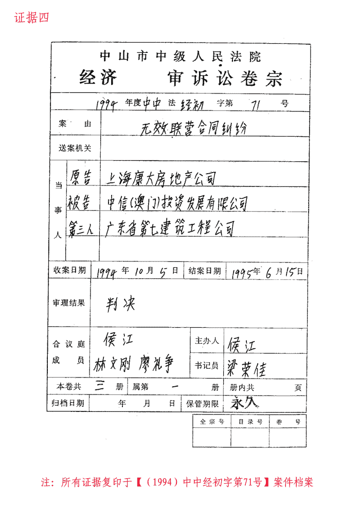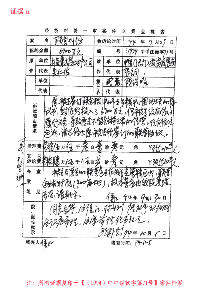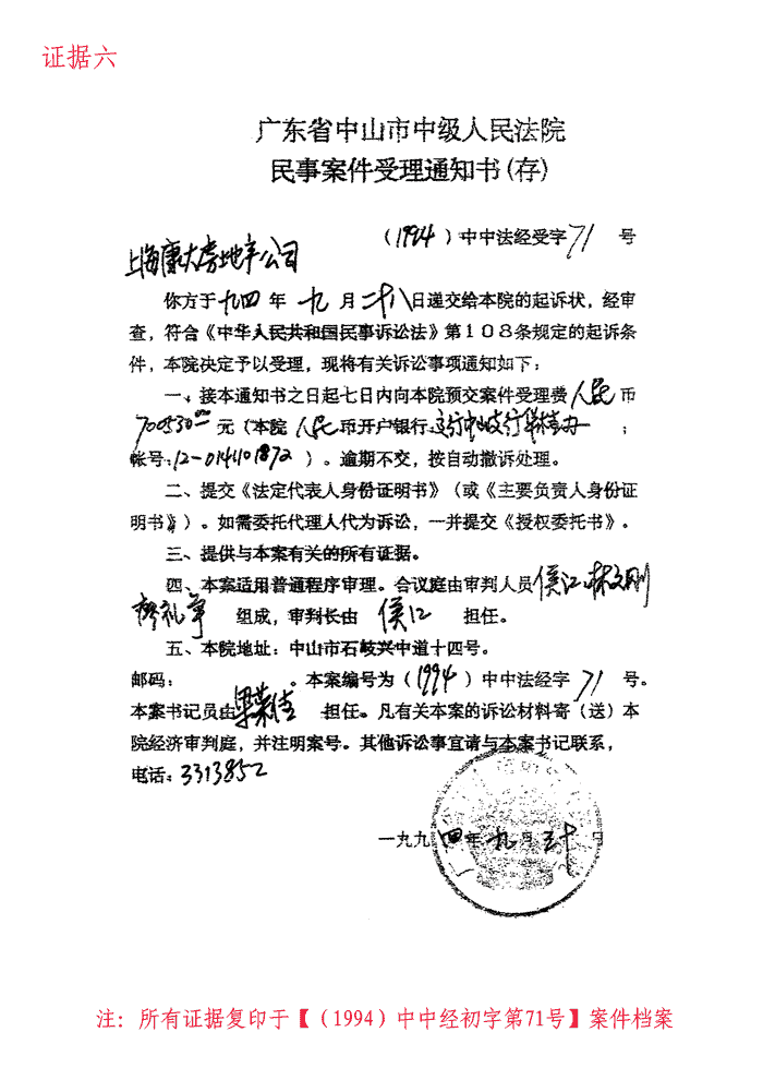 二、【(1994)中中经初字第71号】案件,收案日期是1994年10月5日(证据四),案件立案呈批表中,院、庭长领导同样是在1994年10月5日批示“同意立案,由侯江、林文刚、廖礼争三人合议庭审理,由梁荣佳任书记员”( 证据五)。但有悖于常理,为什么侯江会早在1994年9月30日向原告上海康大公司发出《民事案件受理通知书》(证据六)?为什么会早在1994年9月30日的《民事案件受理通知书》上,预先知道由侯江、林文刚、廖礼争三人合议庭审理,由梁荣佳任书记员?为什么案件立案呈批表(证据五)不是由立案庭法官填写,而是由侯江自己填写?为什么侯江明知道刘海奇、龙伟明身为国资所原中山市对外经济律师事务所公职律师(国家工作人员),却同意他们以公民身份参加庭审诉讼,没在提出异议?