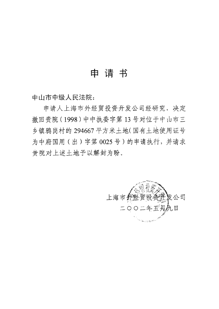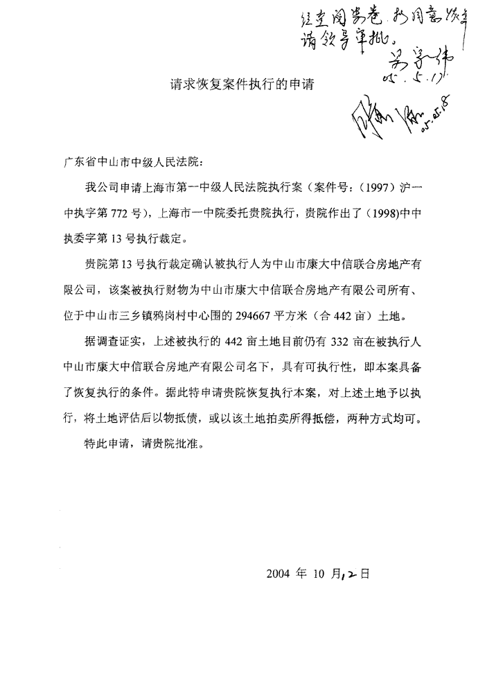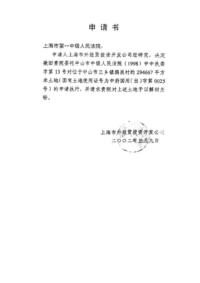 在上海一中院、申请人上海外经公司于2002年己经向中山中院撤回委托执行下(证据1),2005年5月17日,中山中院执行法官梁家伟,私自在一张连申请人上海外经公司名称都没有、公章都没盖的《请求恢复案件执行的申请》(证据2)右上角写上“经查阅案卷,拟同意恢复。请领导审批。”;2005年5月18日,主管执行的副院长侯江在《请求恢复案件执行的申请》右上角批示“同意”。随后就作出(1998)中中法执委恢字第13-1-1号《民事裁定书》、《协助执行通知书》(证据3),查封了联合公司332亩涉案土地。对此,陈浩唯认为,主管执行副院长侯江、执行法官梁家伟的具体行为,已构成触犯我国《刑法》第399条规定的枉法裁判罪、枉法执行罪的行为。