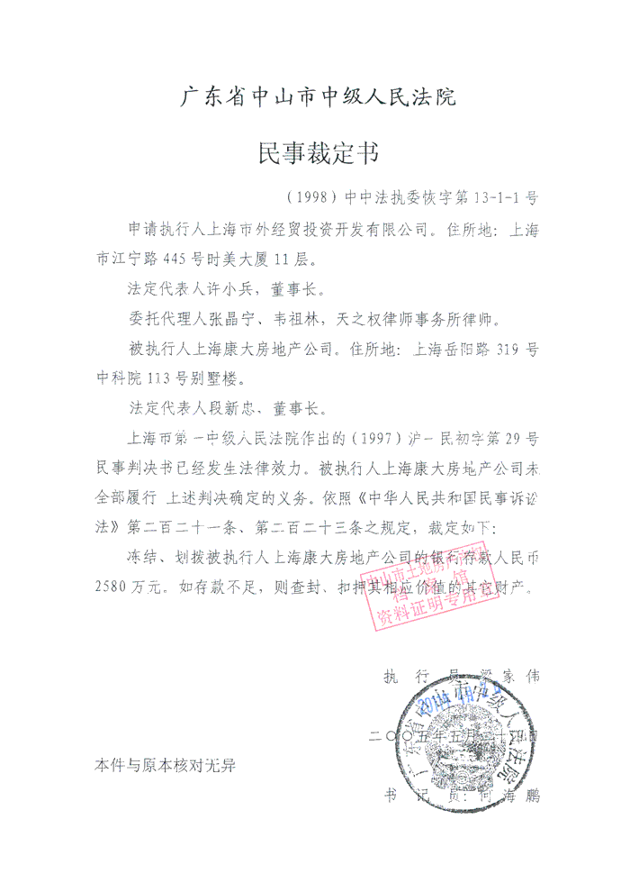 在拍卖会上,举8号牌投得332亩涉案土地是雅居乐全资公司中山雅城公司(以下简称雅居乐)法人代表吴小平(证据4),雅居乐在拍卖之前已经与被执行人上海康大前法人代表段新忠签订合作合同,由雅居乐对拍卖提供法律服务,332亩涉案土地拍卖款超过2.5亿元部分,要全部返还给雅居乐。但由于在拍卖后返还2.2亿元拍卖款问题上,段新忠与雅居乐出现争议,雅居乐以中山雅城公司名义向广东高院起诉上海康大,提起合作纠纷诉讼,案号:(2012)粤高法民二初字第1号(证据5),并查封了拍卖款2.2亿元。案件至今还未结案。