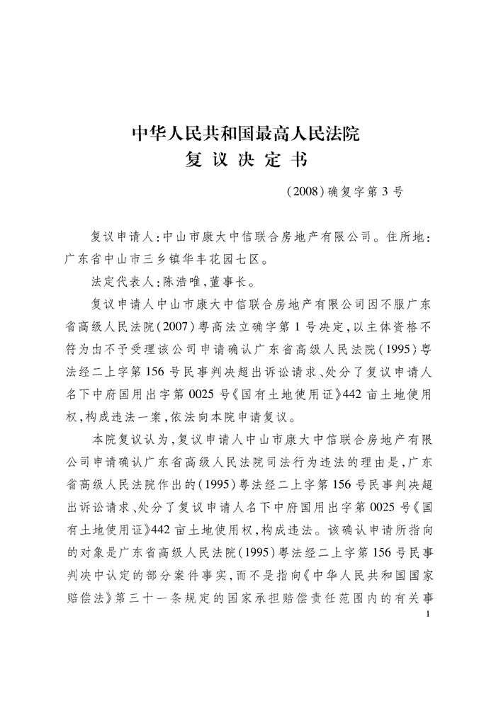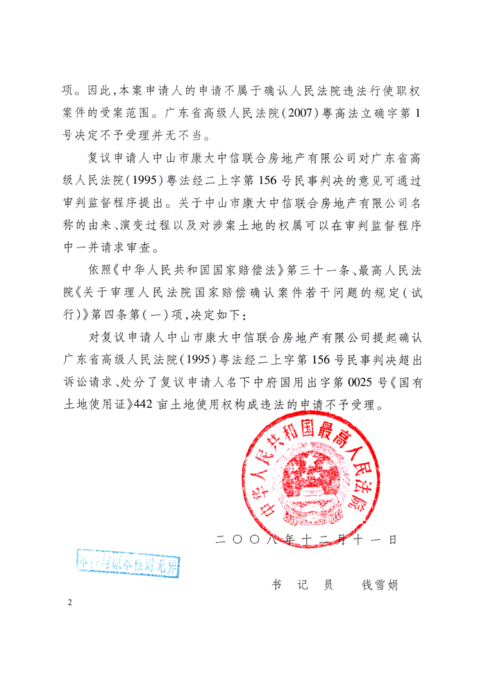 对于联合公司申请6亿元国家赔偿,广东高院不予立案。联合公司向最高院请求复议,最高院经复议后,于2008年12月11日作出的(2008)确复字第3号《复议决定书》(证据10)认定:“复议请求人中山市康大中信联合房地产有限公司对广东省高级人民法院(1995)粤法经二上字第156号民事判决的意见可通过审判监督程序提出。关于中山市康大中信联合房地产有限公司名称的由来、演变过程以及对涉案土地的权属可以在审判监督程序中一并请求审查”,驳回联合公司请求广东高院确认违法,请求国家赔偿6亿元的申请。