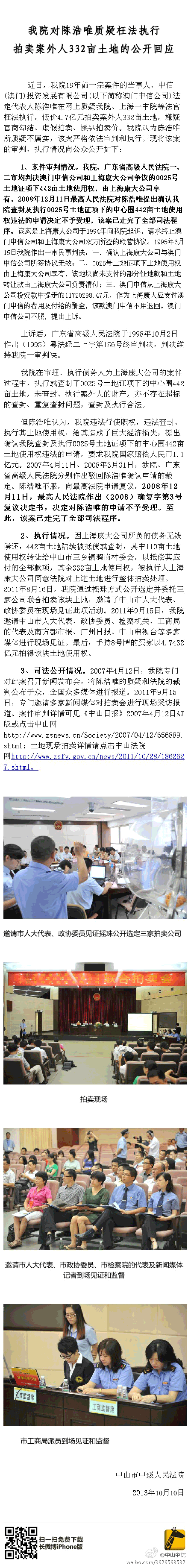 2013年10月10日,中山中院在官方网上的回应,完全回避了执行法官在拍卖会上声称受上海高院、上海一中院委托拍卖332亩涉案土地,事后又声称在执行过程中,上海法院已委托的事实,显然心中有鬼,该拍卖有假。鉴于执行法官在拍卖会上公开声称受上海高院、上海一中院委托拍卖332亩涉案土地,陈浩唯已决定委托律师向最高院申请增加上海高院作为国家赔偿一案,共同赔偿人民币13.28亿元的赔偿义务人。陈浩唯希望在向最高院提交申请之前,中山中院领导能够公开明确答复,是否在拍卖之前,已经得到上海高院、上海一中院委托拍卖332亩涉案土地?以免将来在最高院审查申请国家赔偿13.28亿元一案时,上海高院、上海一中院否认有委托中山中院拍卖332亩涉案土地一事,要求中山中院纠正错误,执行回转涉案土地。如果中山中院领导还继续包庇违法乱纪法官,到时,将无颜面对中山所有法官,以及负责监督见证拍卖的市人大、政协、公、检、法等单位领导。