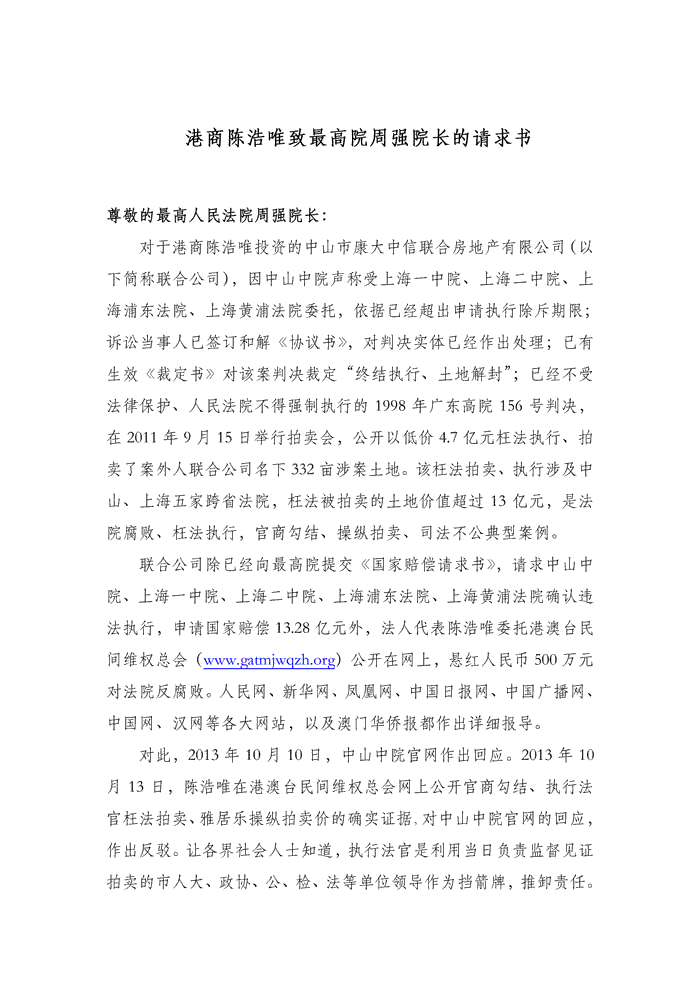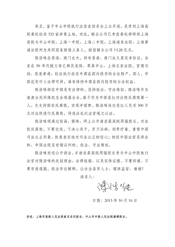 陈浩唯向最高人民法院提交《国家赔偿请求书》,状告中山中院、上海一中院、上海二中院、上海浦东法院、上海黄浦法院违法执行,请求共同国家赔偿13.28亿元。