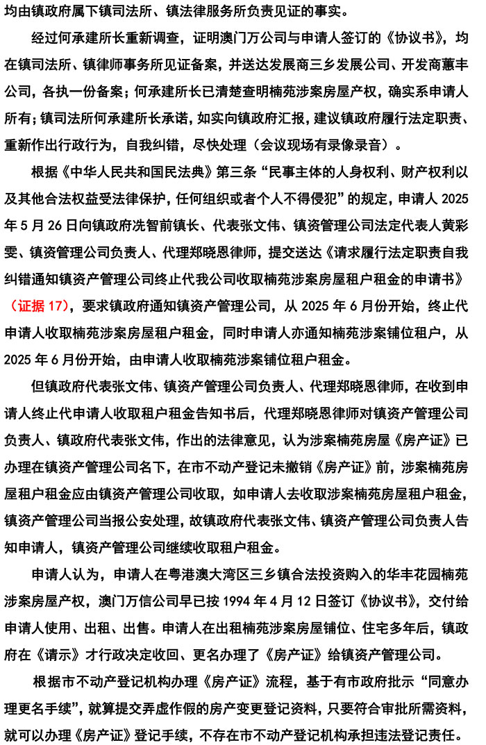 链接7: 2025年5月26日致三乡镇政府、三乡司法所和镇资产公司的《请求履行法定职责自我纠错通知镇资产公司终止代我公司收取涉案房屋租金的申请书》