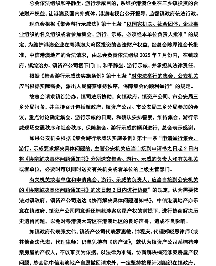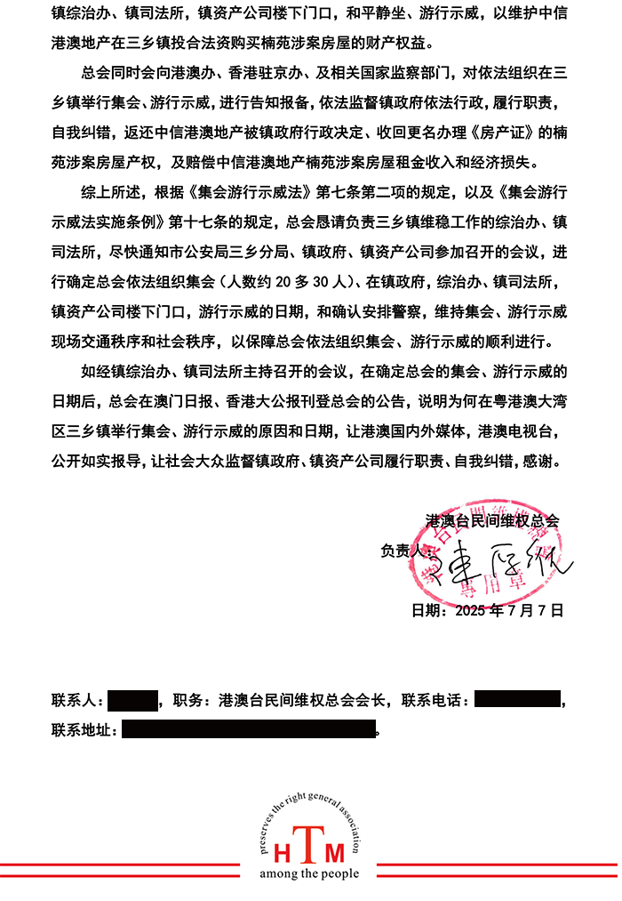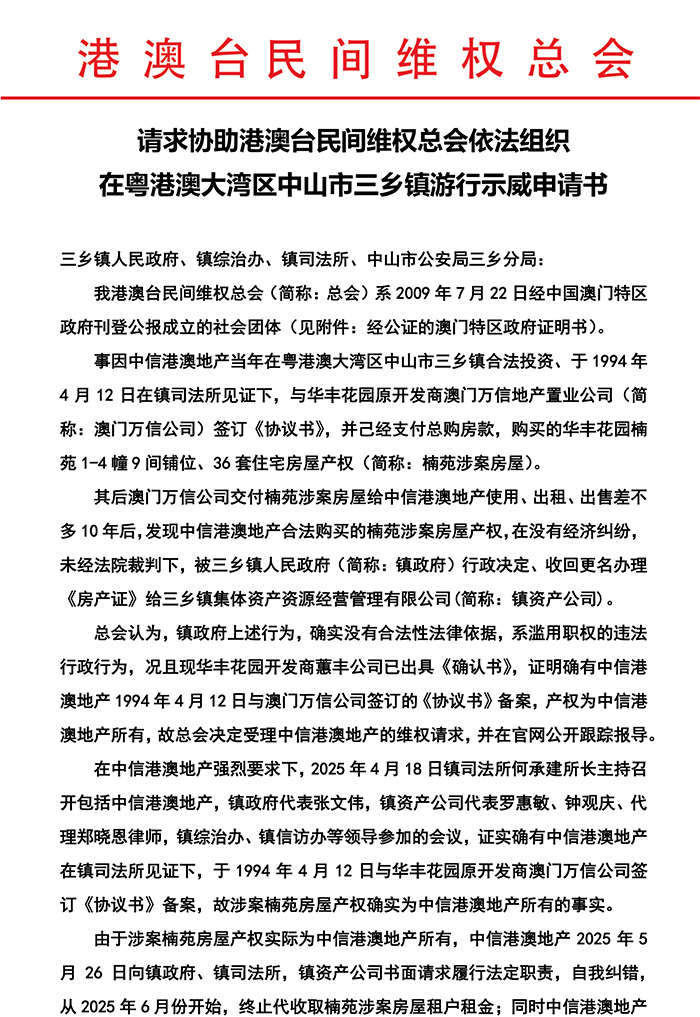 链接2: 2025年7月7日《请求协助港澳台民间维权总会依法组织在粤港澳大湾区中山市三乡镇游行示威申请书》