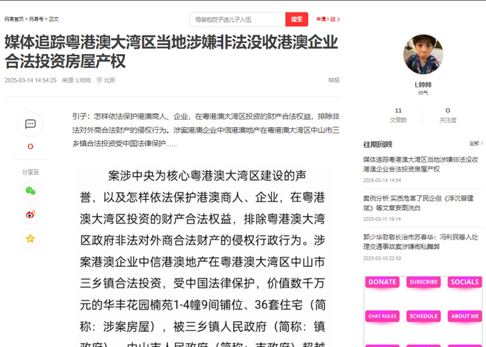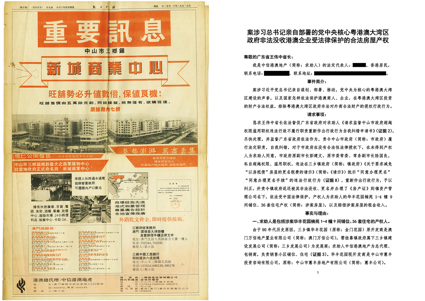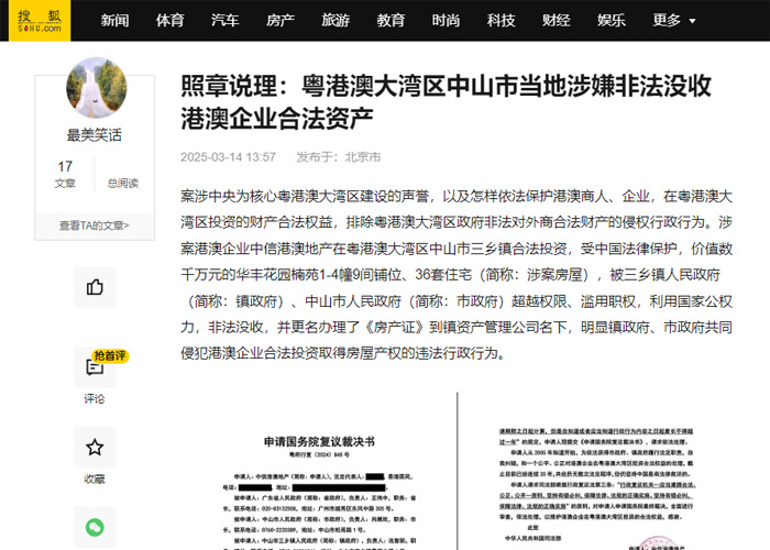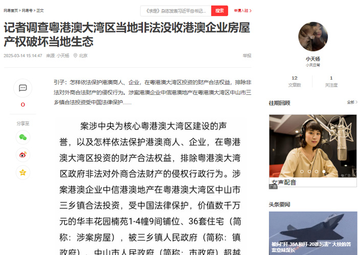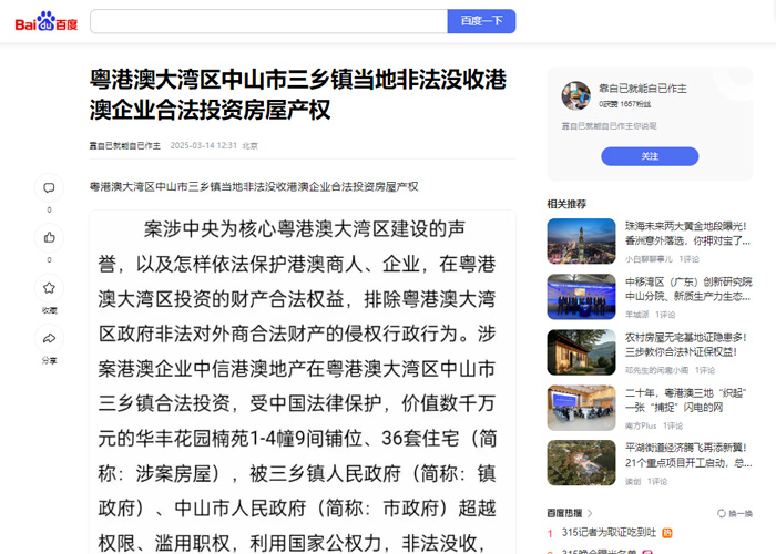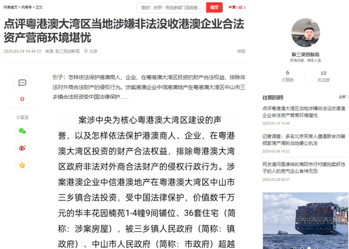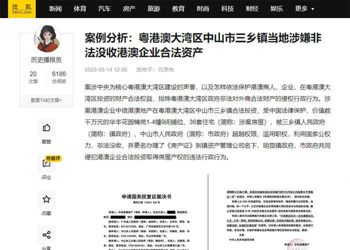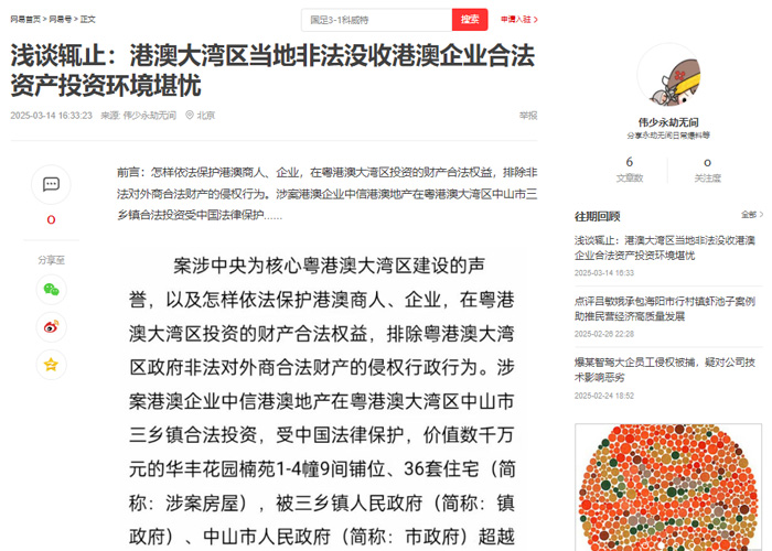 案涉习近平总书记亲自谋划、部署、推动,党中央为核心粤港澳大湾区建设的声誉,以及怎样依法保护港澳商人、企业,在粤港澳大湾区投资的财产合法权益,排除粤港澳大湾区政府非法对外商合法财产的侵权行政行为。涉案港澳企业中信港澳地产在粤港澳大湾区中山市三乡镇合法投资,受中国法律保护,价值数千万元的华丰花园楠苑1-4幢9间铺位、36套住宅(简称:涉案房屋),被三乡镇人民政府(简称:镇政府)、中山市人民政府(简称:市政府)超越权限、滥用职权,利用国家公权力,非法没收,并更名办理了《房产证》到镇资产管理公司名下,明显镇政府、市政府共同侵犯港澳企业合法投资取得房屋产权的违法行政行为。