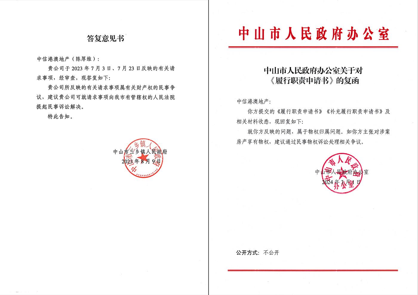 镇政府2023年8月9日对中信港澳地产作出《答复意见书》;“贵公司所反映的有关请求事项属有关财产权的民事争议,建议贵公司就请求事项向法院提起民事诉讼解决”,驳回中信港澳地产请求镇政府履行法定职责、自我纠错,返还中信港澳地产涉案房屋财产;进而2024年3月1日市政府办公室对中信港澳地产作出《中山市人民政府办公室关于对履行职责申请书的复函》:“就你方反映的问题,属于物权归属问题,如你方主张对涉案房屋享有物权,建议通过民事物权诉讼处理相关争议”,驳回中信港澳地产向市政府提交的《履行职责申请书》。