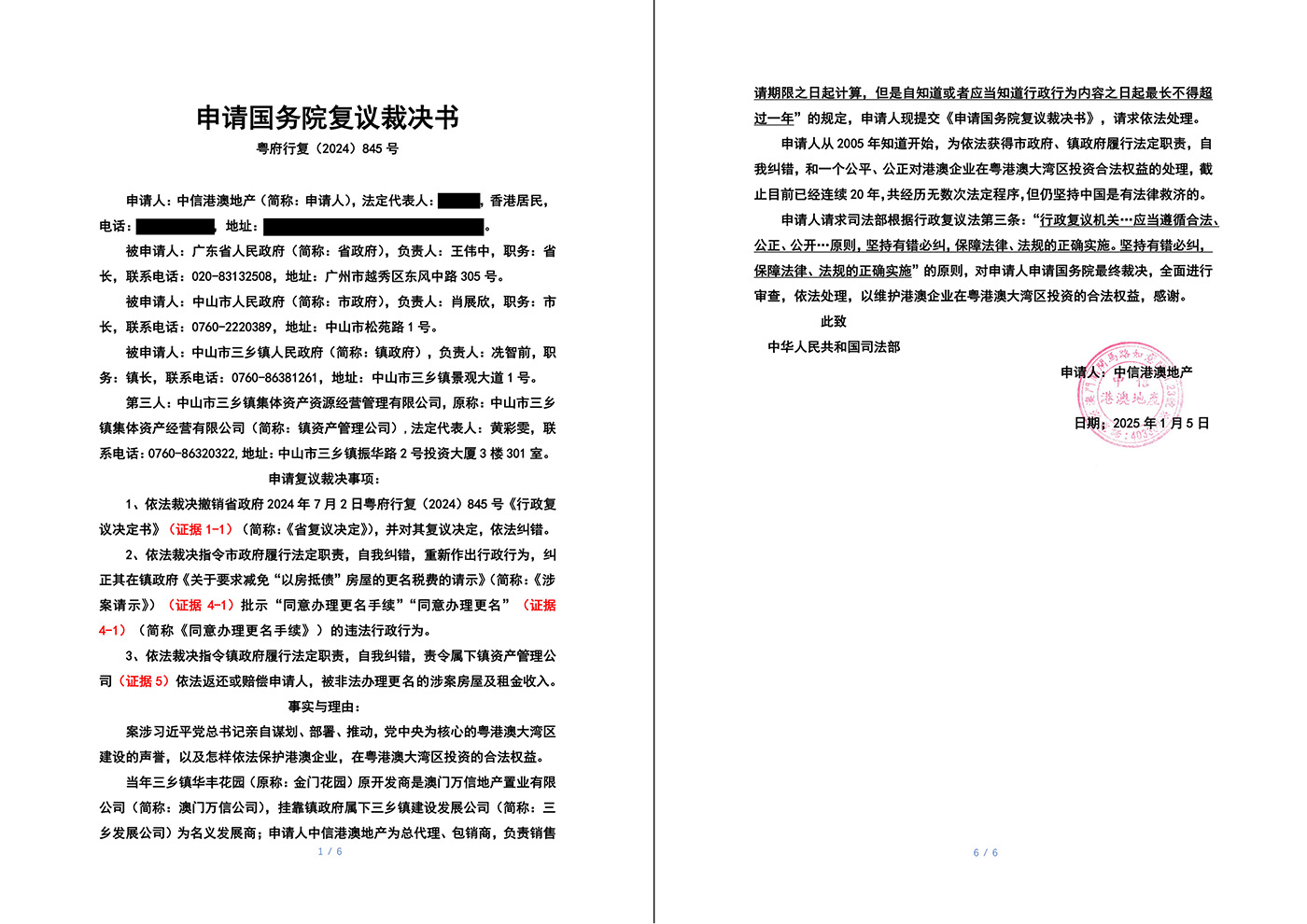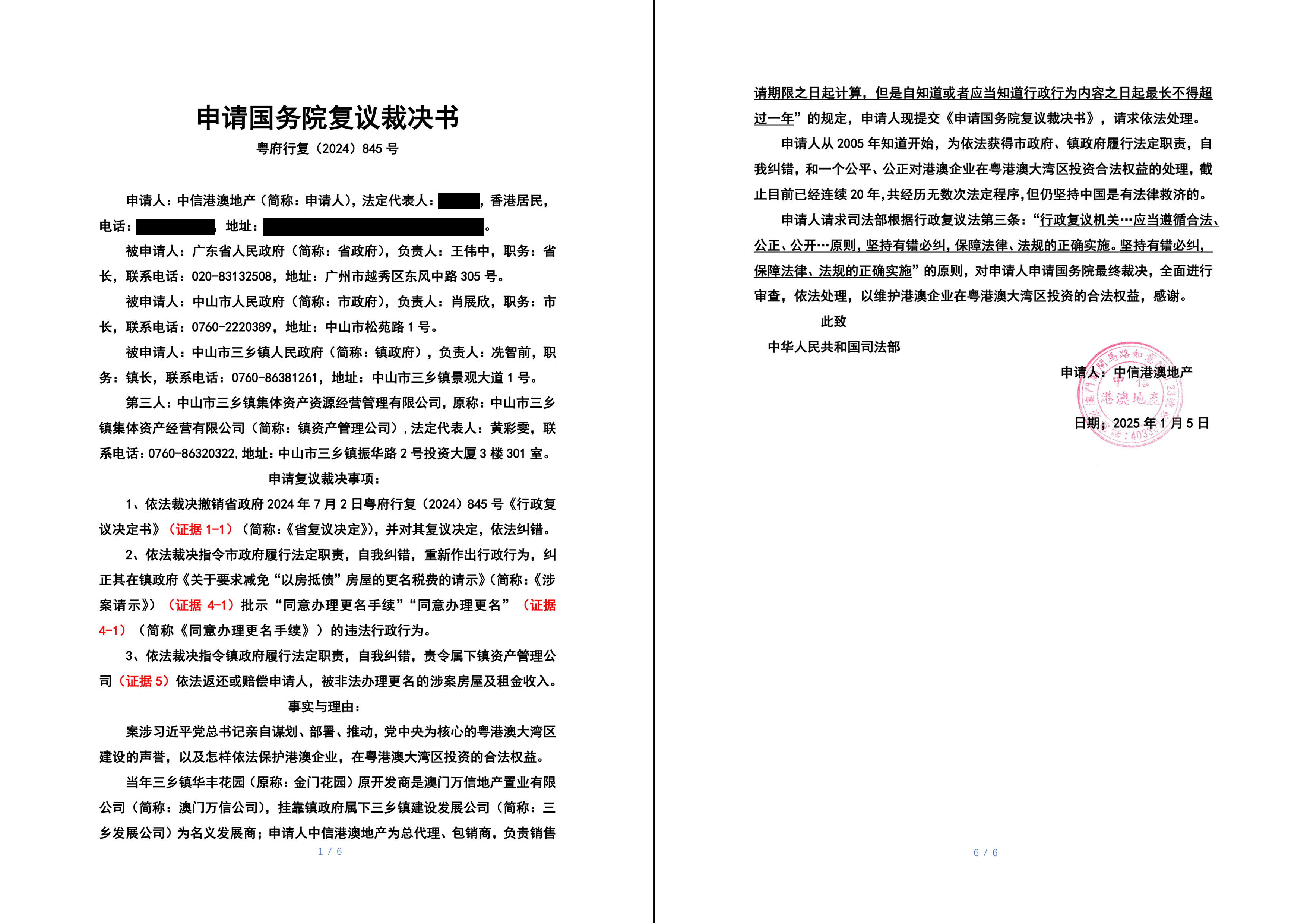 2025年2月5日,中信港澳地产向中华人民共和国司法部提交《国务院复议裁决申请书》,两会期间,中信港澳地产法定代表人亲自到北京,并得到司法部告知,《国务院复议裁决申请书》已经受理,等待该案件负责人依法处理。