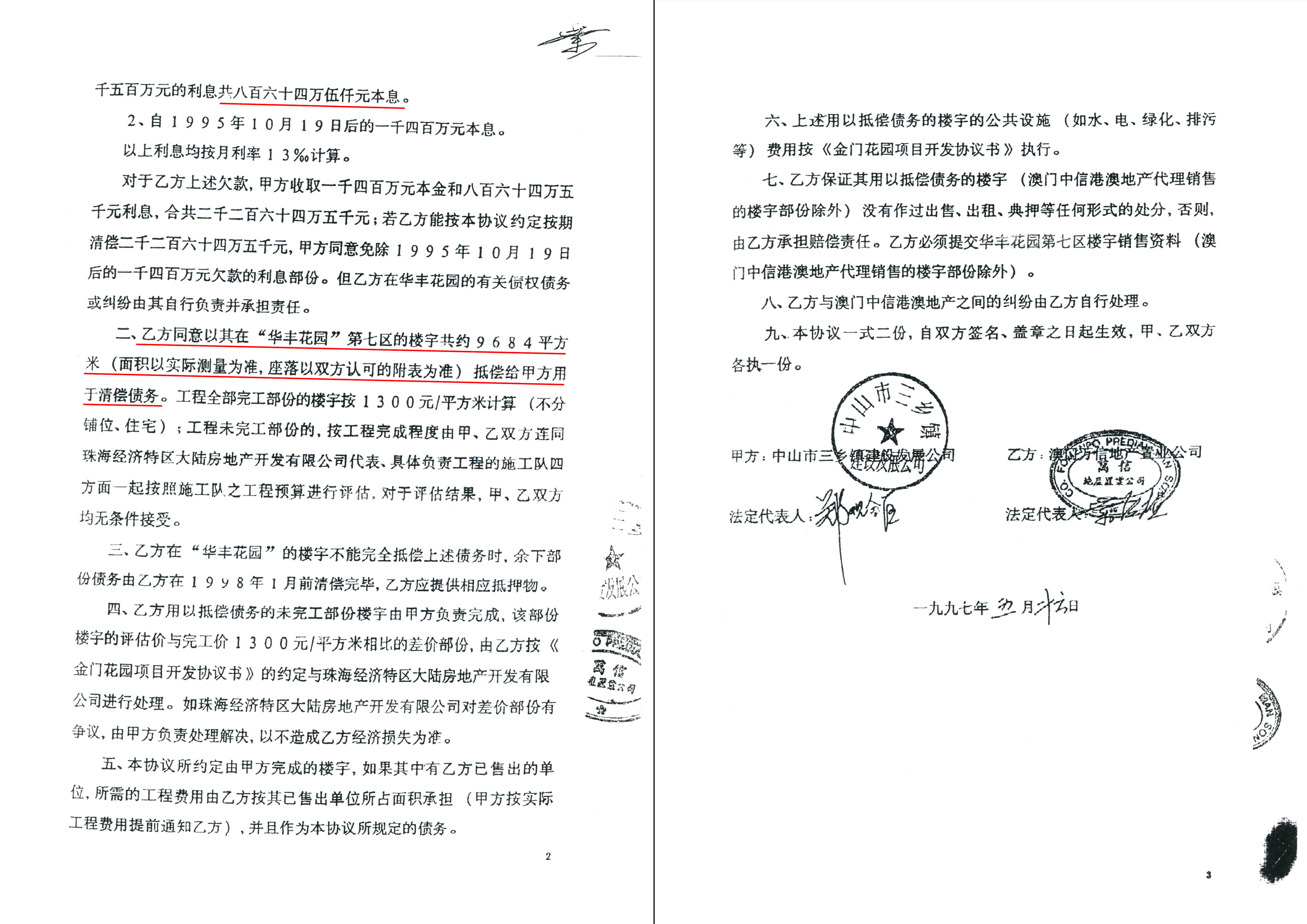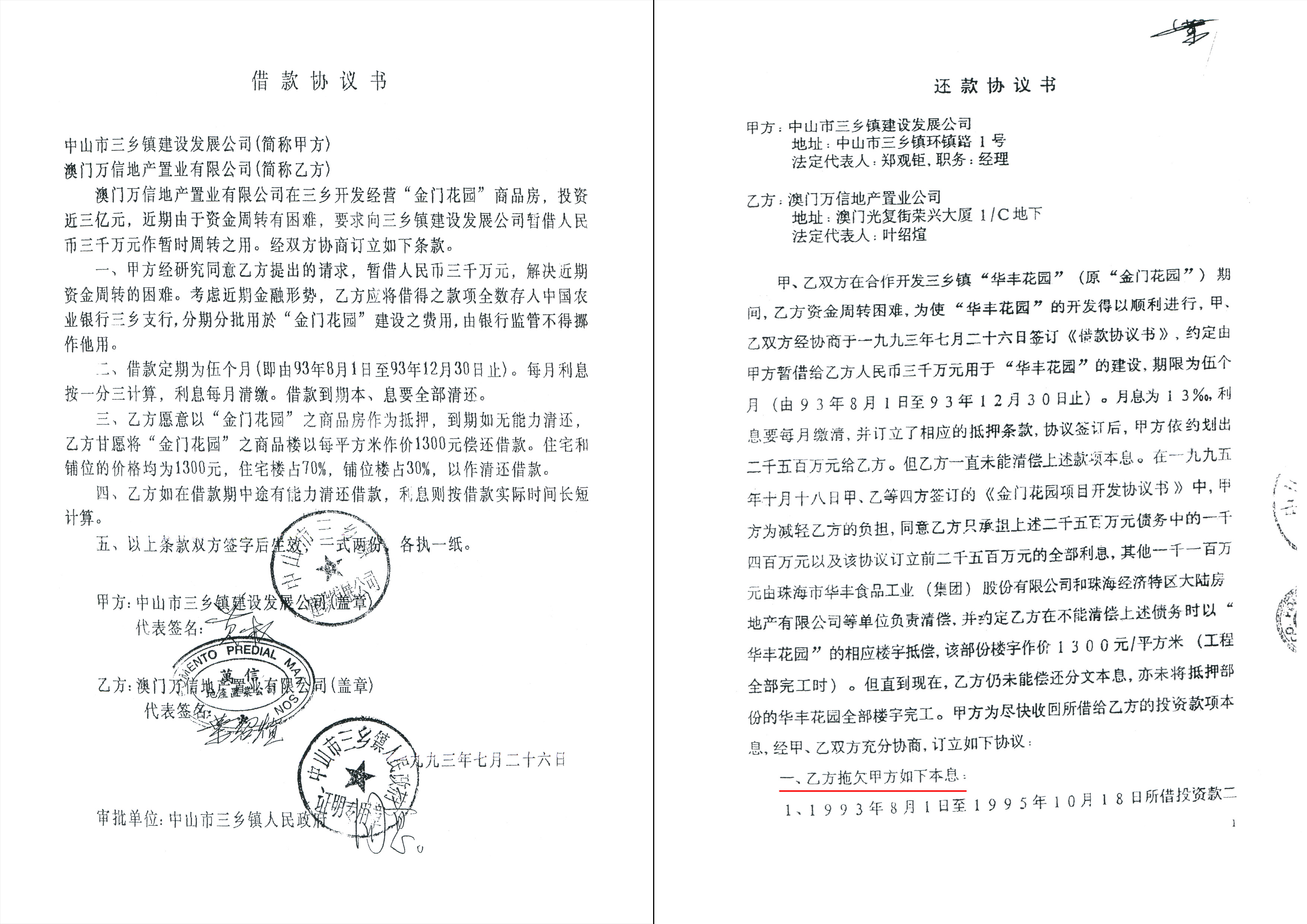 因镇政府盖章批示“同意”三乡发展公司签订《借款协议书》放高利贷借款3000万元给澳门万信公司,先收取砍头息500万元,期限五个月,月息1.3%(月息39万元,不包括砍头息)。其后澳门万信公司退出开发,蕙丰公司接手开发华丰花园,澳门万信公司与三乡发展公司签订《还款协议书》,《还款协议书》第七条特别约定:“澳门中信港澳地产代理销售的楼宇部份除外”,说明《还款协议书》与中信港澳地产无关,中信港澳地产无需承担还款责任。