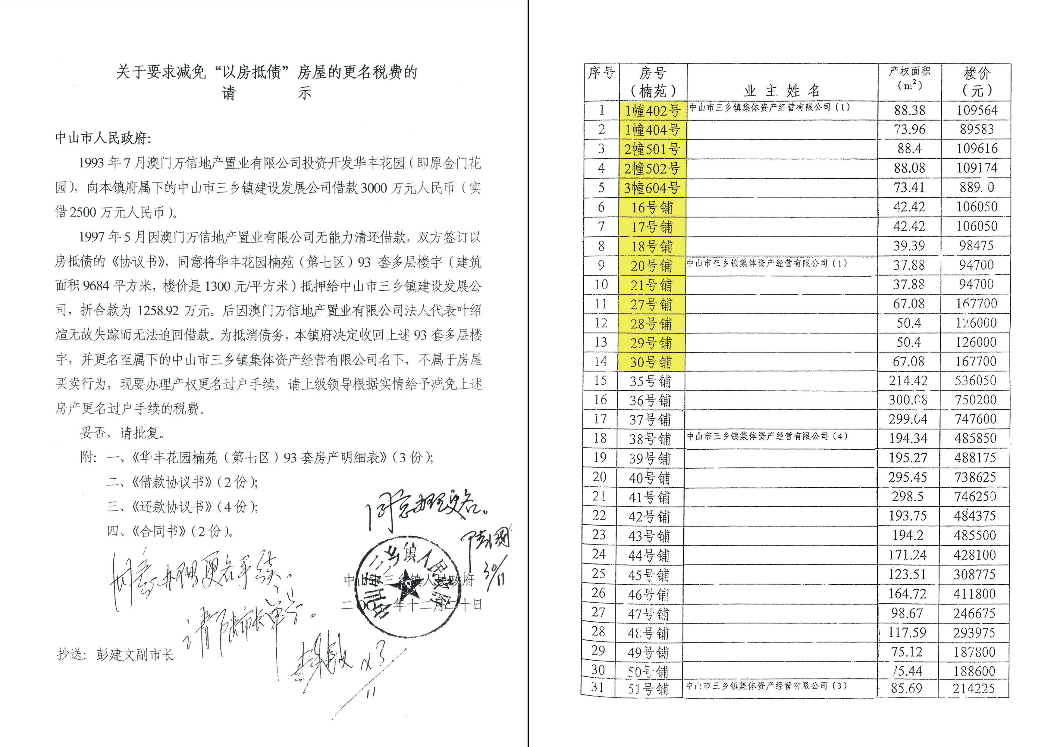 何况镇政府《请示》的93套“以房抵债”楼宇名单,与镇政府作出《1993年澳门万信地产置业公司“以房抵债”的房产(93户)登记统计表》的93套“以房抵债”楼宇名单,不一样,是两个不同的93套“以房抵债”楼宇名单;而且澳门万信公司在《还款协议书》只尚欠8645000元借款本息,就算镇政府依法向法院提起诉讼解决争议,经评估作价抵债,澳门万信公司也无需用华丰花园楠苑27间铺位、66套住宅(93户)“以房抵债”,显然镇政府有问题,有意为之。更不可思议的是,镇政府提交《请示》的日期,和原副市长彭建文批示“同意办理更名手续”的日期,以及原常务副市长陆国良批示“同意办理更名”的日期,均是前后倒置的,作为市政府领导原副市长、原常务副市长,怎会犯如此低级的错误。