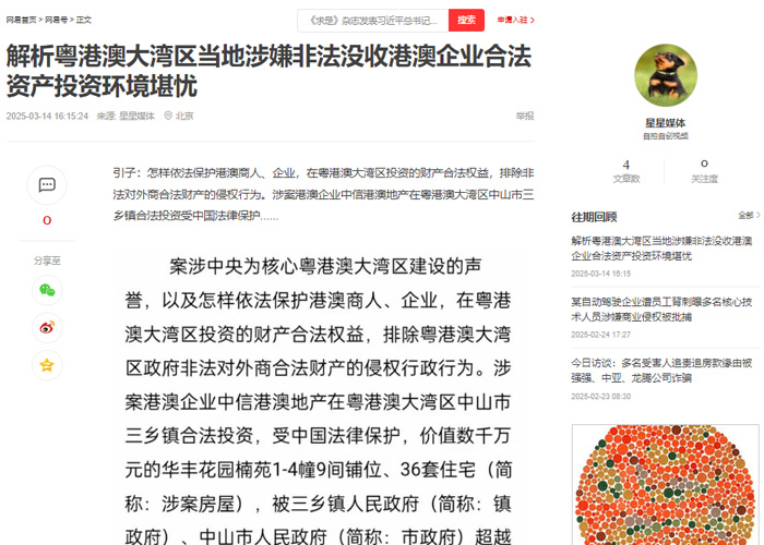 为了维护习近平总书记亲自谋划、部署、推动,党中央为核心的粤港澳大湾区建设的声誉,在两会期间,中信港澳地产法定代表人亲自到北京向香港特区政府驻京办求助,请求香港特区政府驻京办协助代转交广东省王伟中省长的求助书,并送广东省港澳事务办公室、香港特区政府政制及内地事务局备案。