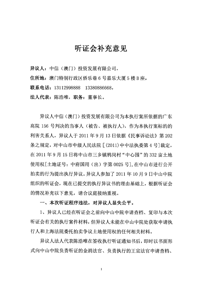 >> 《听证会补充意见》--中信(澳门)投资发展有限公司