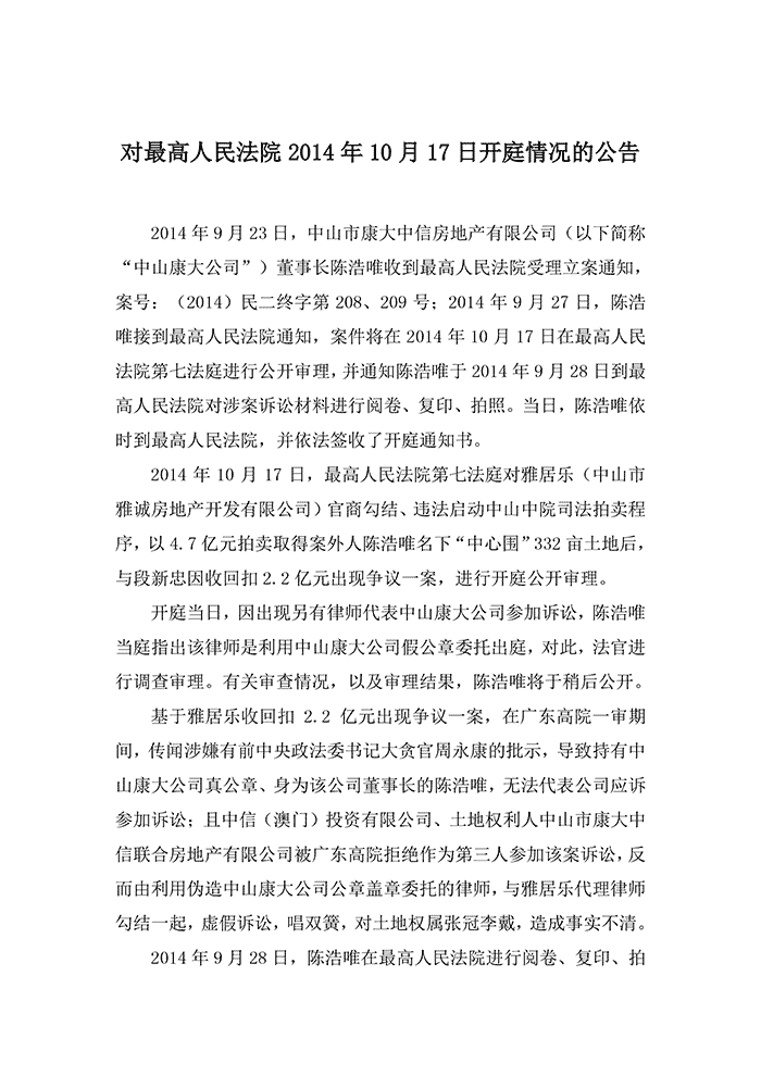 >> 对最高人民法院2014年10月17日开庭情况的公告