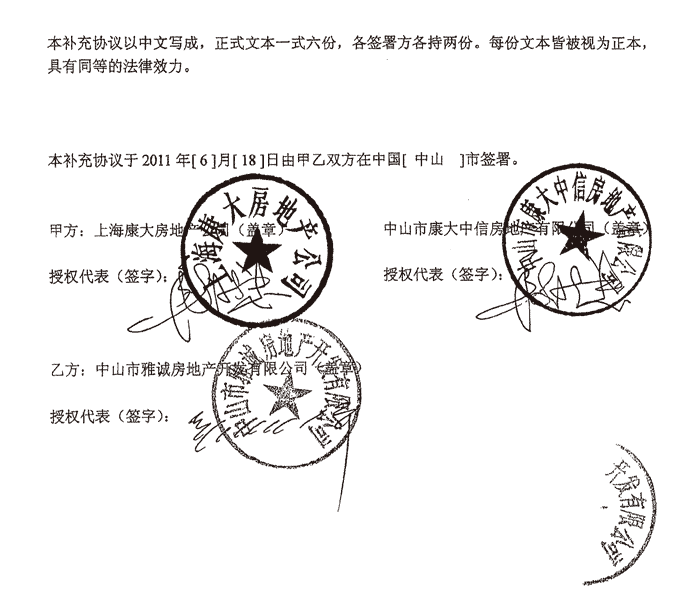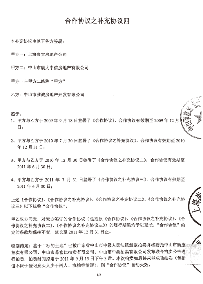 雅居乐2011年6月18日签订的《合作协议之补充协议四》之特别约定项下明确表述为:“鉴于标的土地已被广东省中山市中级人民法院裁定拍卖并将委托中山市新康拍卖有限公司、中山市苏富比拍卖有限公司、中山市中昊拍卖有限公司发布联合拍卖公告进行拍卖,拍卖时间拟定于2011年9月15日,下午3时”。显然中山中院虚假摇珠、违规操作。