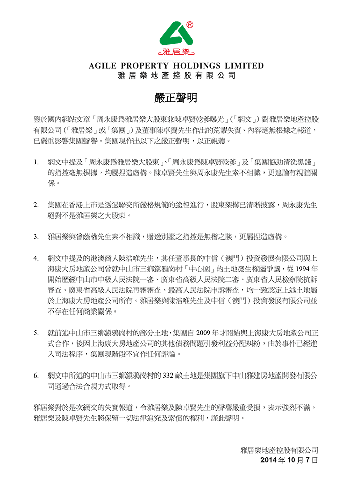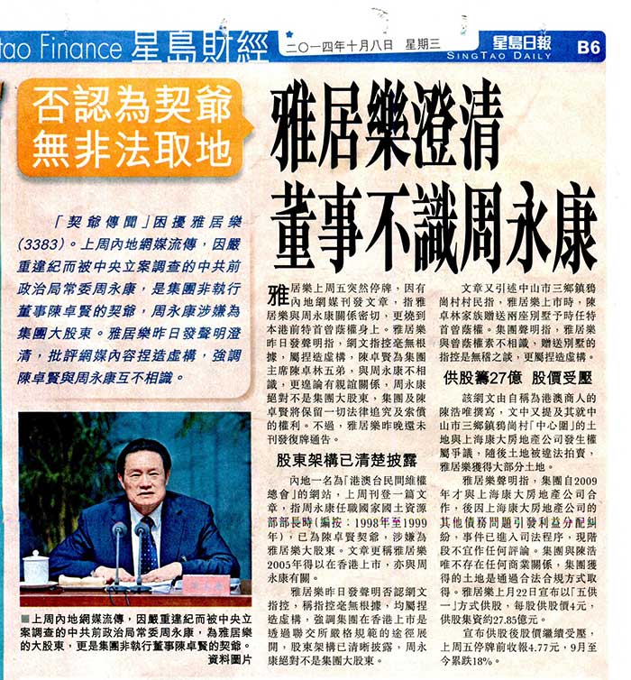 随着周永康涉嫌为雅居乐大股东、陈卓贤干爹,以及陈卓林家族涉嫌贪污收取回扣2亿多元;以及没有如实向雅居乐小股东公开披露重大诉讼事件,损害小股东权益和知情权陆续曝光,香港证监会随时会宣告雅居乐停牌、接受调查,或交由香港警方商业犯罪调查科处理。因此,将可能导致陈卓林家族被调查,雅居乐股价大跌,银行要求提早还借债,其后果非常严重。