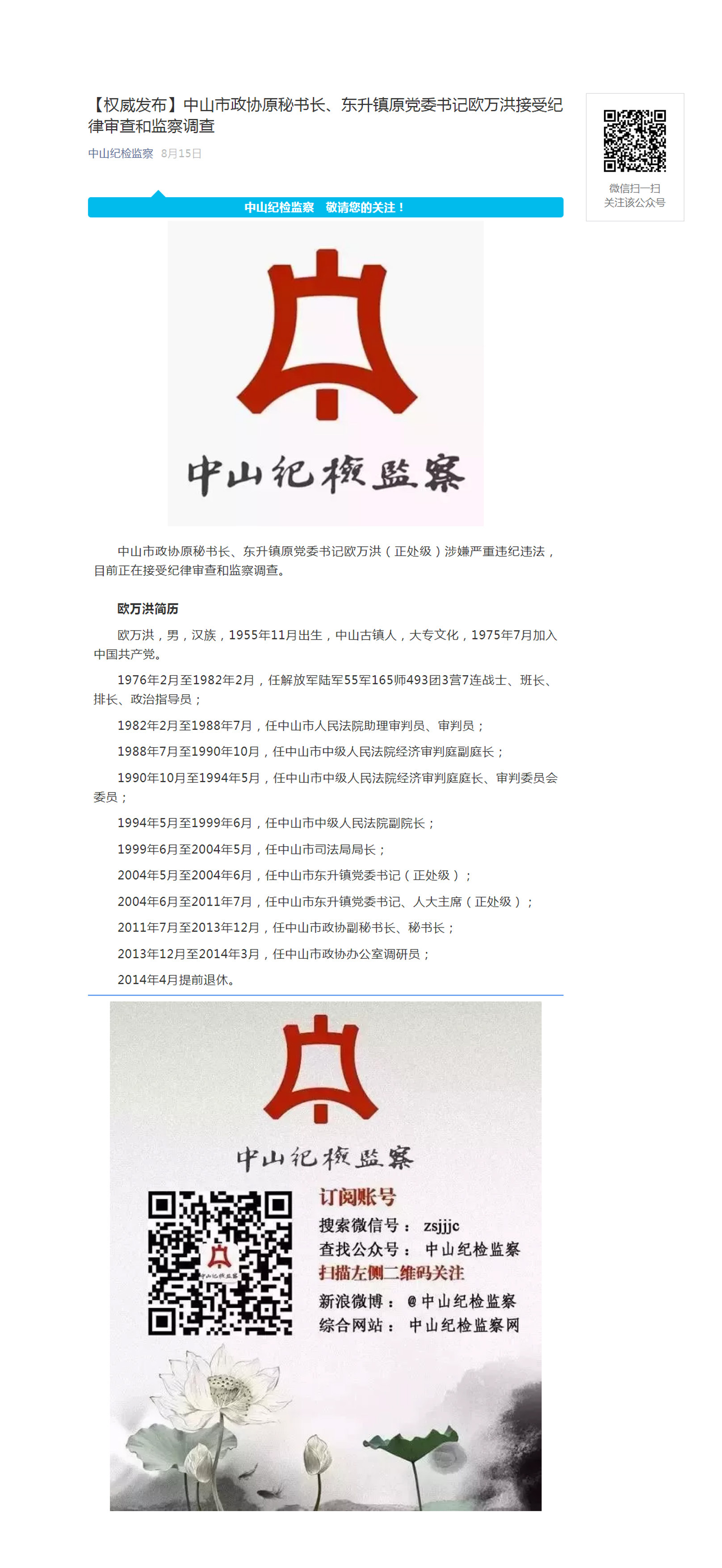 >> 中山市政协原秘书长、东升镇党委书记欧万洪接受纪律审查和监察调查